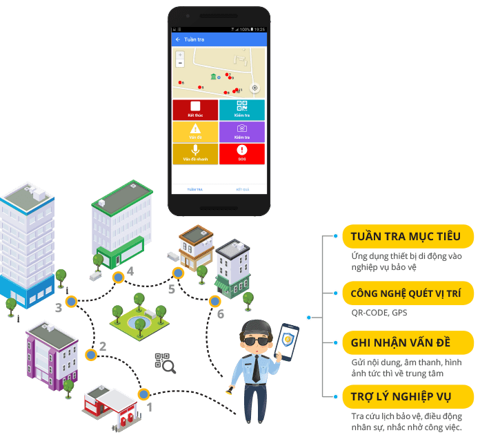 Tuần tra bảo vệ mục tiêu trực tuyến với công nghệ nhận dạng vị trí tuần tra (checkpoint) bằng việc quét QR-Code, GPS.